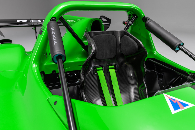 Putting safety first, new seating options have been launched for both SR3 XXR and SR10 XXR. An all-new carbon single seat has been designed in-house by the Radical research and development team in response to customer feedback. This was primarily driven by a demand in the USA where this specification is popular, and sees the new seat feature an integrated wrap-around headrest and made of pre-impregnated carbon fiber, resulting in a seat that is both stronger and lighter than its GRP predecessor. The carbon single seat is available on left-hand drive, right-hand drive and centre-hand drive configurations.