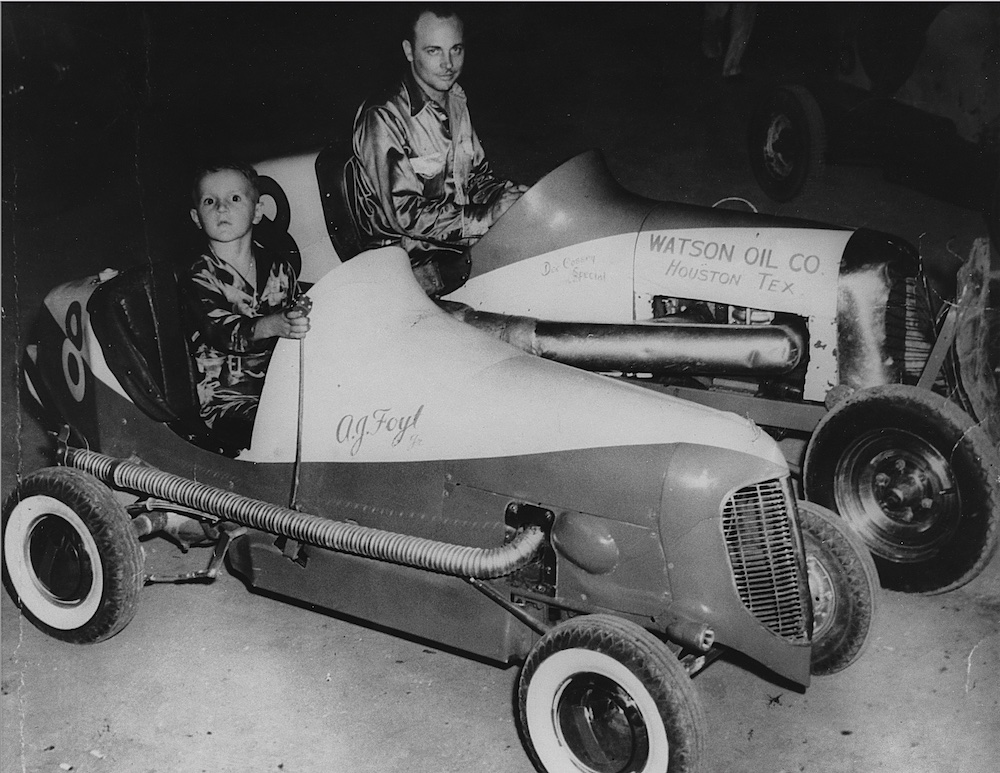 By the time A.J. was five, Tony built his son a replica midget, painted blue and white and carrying No. 8, just like the car known as the “Silver Bullet” that was driven by A.J.’s favorite driver, Doc Cossey. “Daring Doc” was the track champion at the Houston Speed Bowl where Tony often raced his yellow No. 20 midget. While most of the midgets used Ford or Offenhauser engines, the one in A.J.’s car put out just three horsepower.