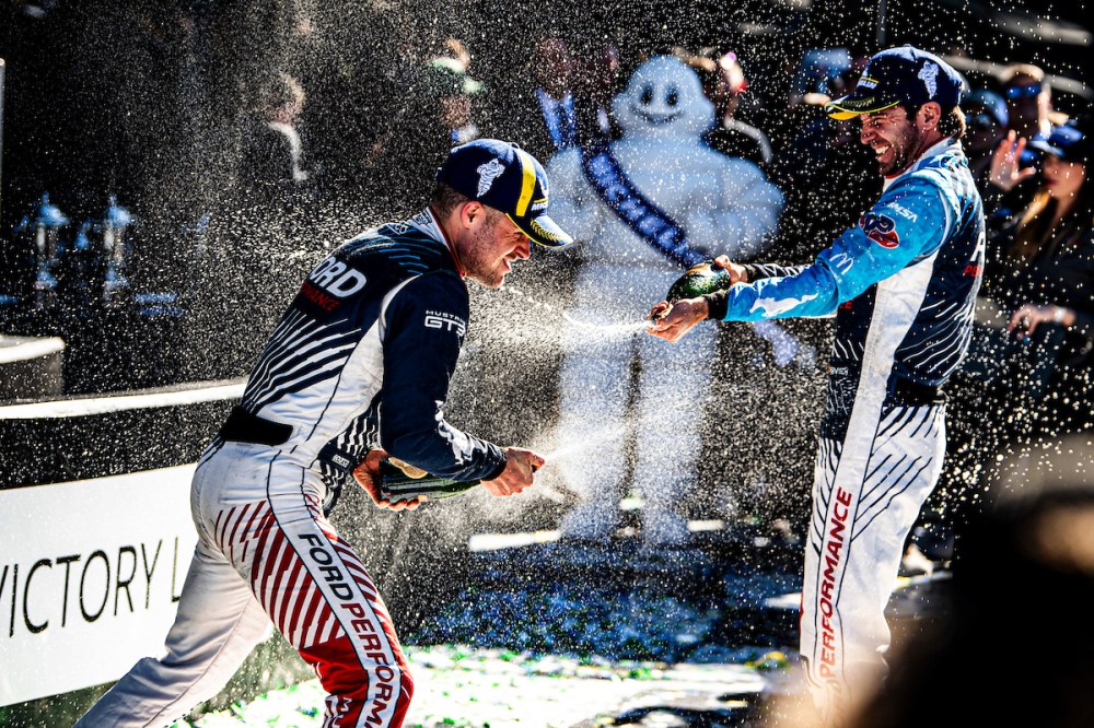 Seven cars finished on the lead lap in class, with heavy-hitters from Corvette, BMW, Mercedes and Ferrari also in the mix. But it was Ford that prevailed after the frantic run to the flag, with Olsen installed in the lead car and Seb Priaulx entrusted to drive the sister No. 64, which made it a double podium with a third-place finish.