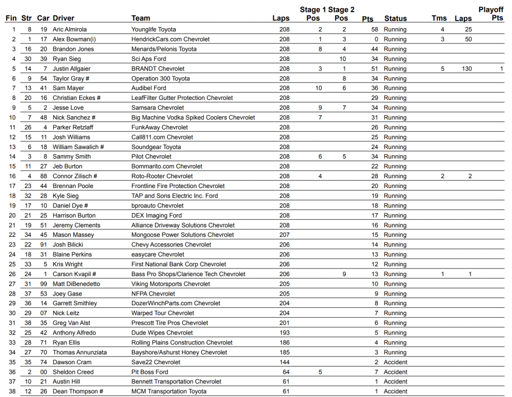 Almirola’s teammate Brandon Jones finished third, followed by owner-driver Ryan Sieg and reigning NASCAR Xfinity Series champion Justin Allgaier, whose No. 7 JR Motorsports Chevrolet led a race-best 130 laps and was out front on that final overtime restart.
