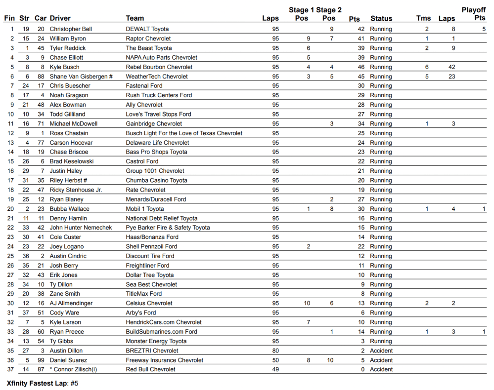 Byron crossed the finish line second with Tyler Reddick just behind. Chase Elliott came home fourth. Busch eventually slipped back to finish fifth.