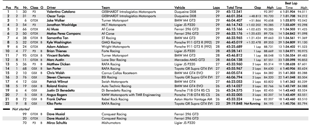 Muss drove the No. 66 AF Corse Ferrari 296 GT3 to his second runner-up result of the day and his fourth GTDX class podium in as many races this season. As a result, Muss now finds himself atop the class point standings by 10 points, 1260-1250, over Adam Adelson, who encountered an early issue in his No. 24 Wright Motorsports Porsche 911 GT3 R that dropped him far behind the field. He eventually battled back to finish sixth in class.