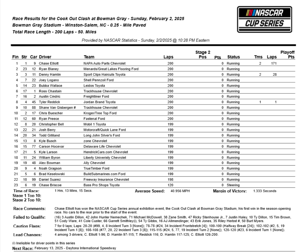 Adroitly working lapped traffic in the closing stages of the 200-lap season-opening exhibition race, Elliott crossed the finish line 1.333s ahead of Blaney, who started last among the 23 competitors on a driver points provisional.