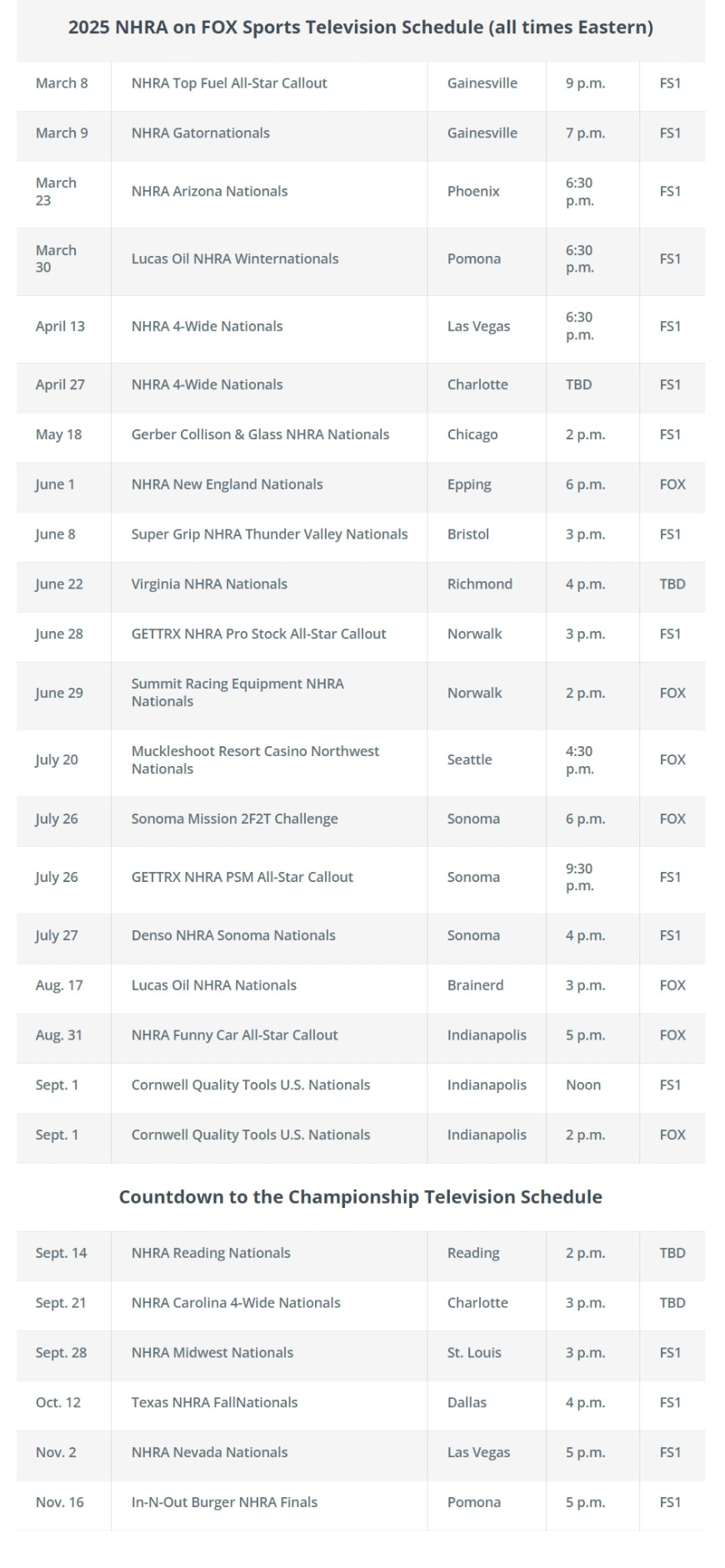 NHRA and FOX Sports announced today the television schedule for the upcoming 2025 NHRA Mission Foods Drag Racing Series season, which includes eight broadcasts on the FOX broadcast network.
