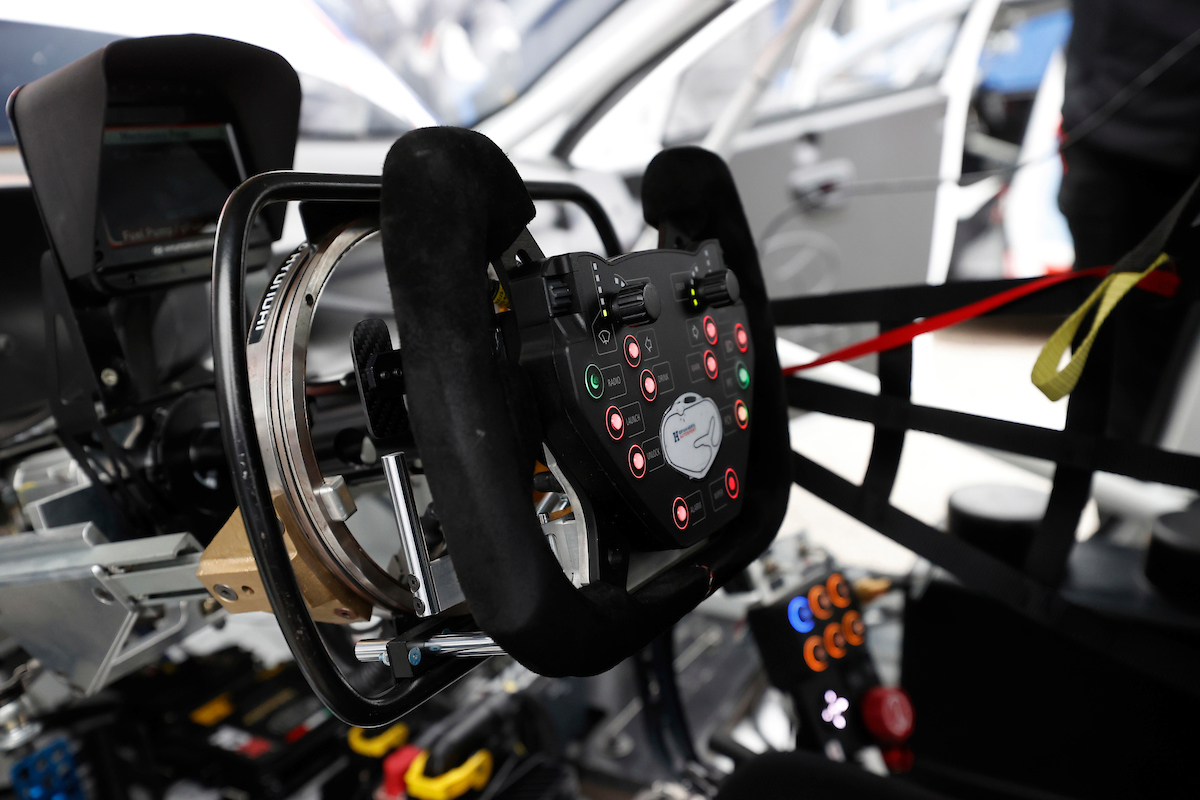 Wickens’ steering wheel with hand controls in the Bryan Herta Autosport w/ Curb-Agajanian, Hyundai Elantra N TCR he drove in the Michelin Pilot Challenge. Michael Levitt/IMSA