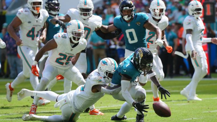 With the Jaguars already up by 10 points and looking to up their lead to 17 late in the third quarter with a first-and-10 at the Miami 13, Etienne took a handoff from quarterback Trevor Lawrence and barreled toward the end zone. But just before he reached the end zone, a hit by Dolphins safety Jevon Holland knocked the football out of Etienne’s hands and into the end zone, where it was recovered by Dolphins cornerback Kader Kohou.