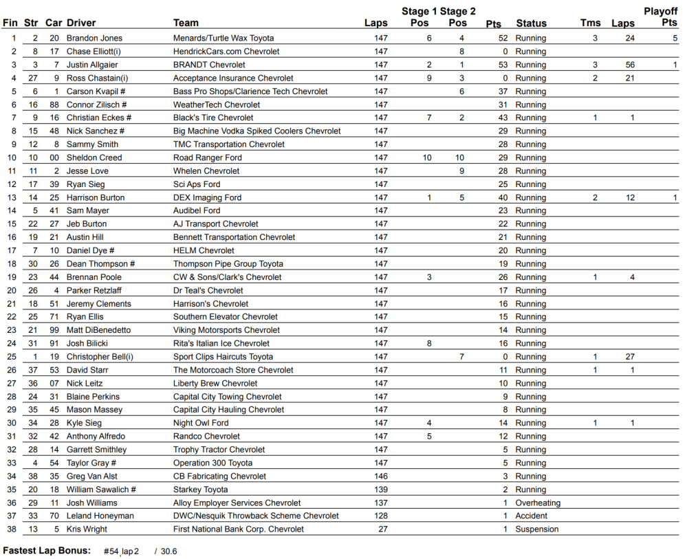 “I am proud of Brandon Jones, I know how hard the kid has worked. He’s done a good job and I’m happy to see him get to victory lane’’ said the reigning series champion Allgaier, who has now tied NASCAR Hall-of-Famer Mark Martin with nine-consecutive top 10s in Xfinity Series races at Darlington.