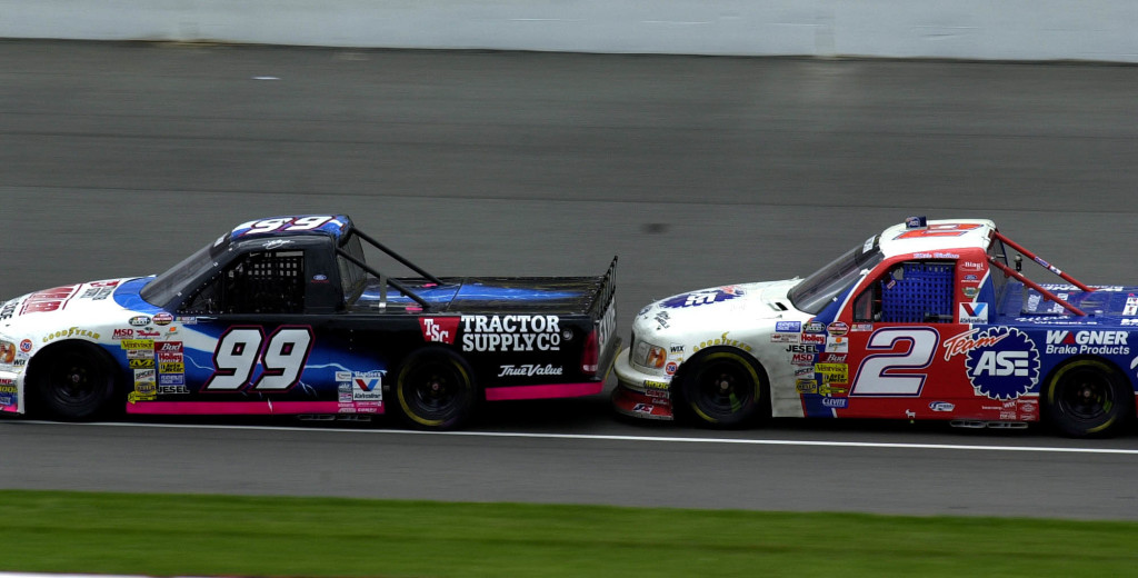 Gong Show success earned Kurt Busch the chance to earn his NASCAR wings in the Truck Series. Here he gets a lesson in bump drafting from Mike Wallace. Phil Abbott/Motorsport Images