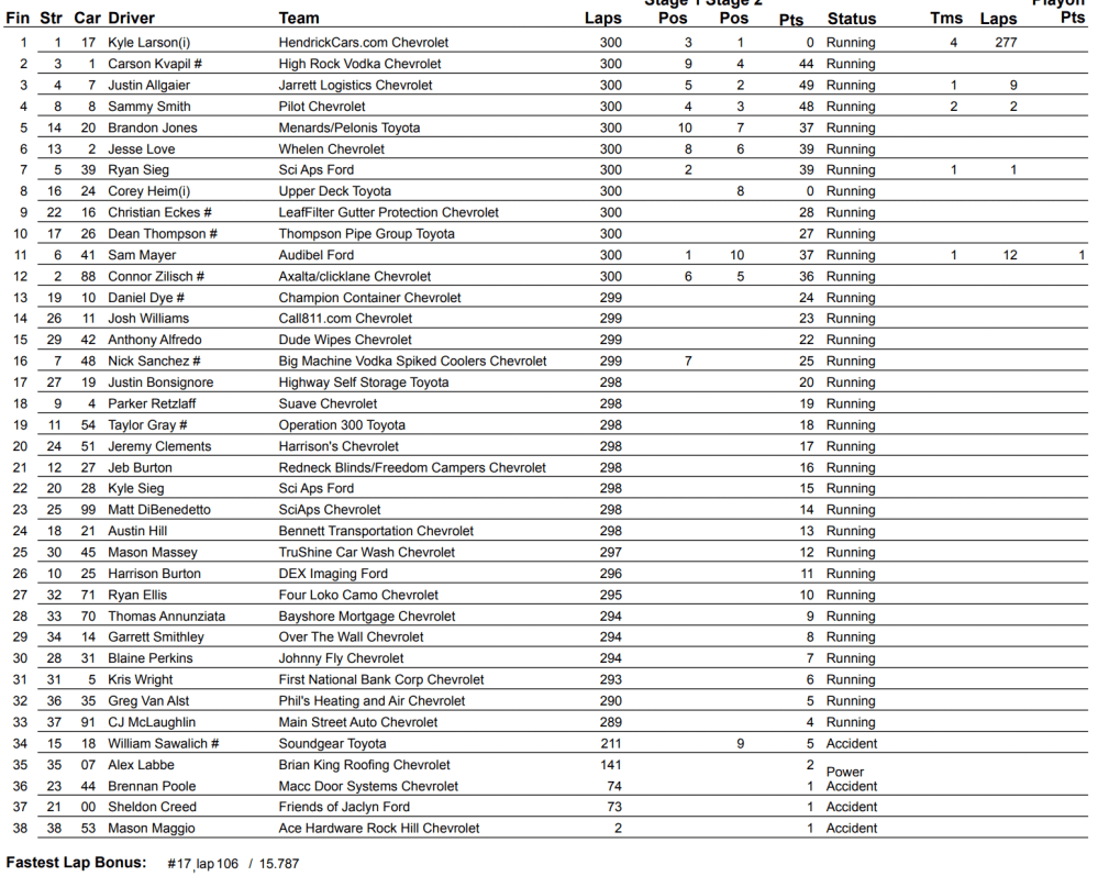 Larson finished 2.054s ahead of Carson Kvapil, who passed series leader Justin Allgaier for second place in traffic on Lap 298. Allgaier held third and collected his record seventh $100,000 Xfinity Dash 4 Cash bonus as the highest finisher among four eligible drivers.