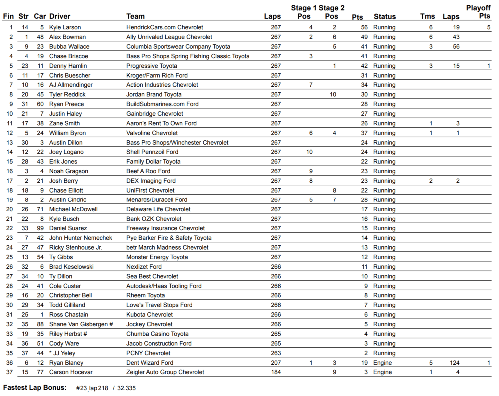 Bowman finished second after leading 43 laps and starting from the pole position. Bubba Wallace, who led 56 laps, finished third. Chase Briscoe finished fourth, and Denny Hamlin finished fifth. Hamlin also won the second stage.