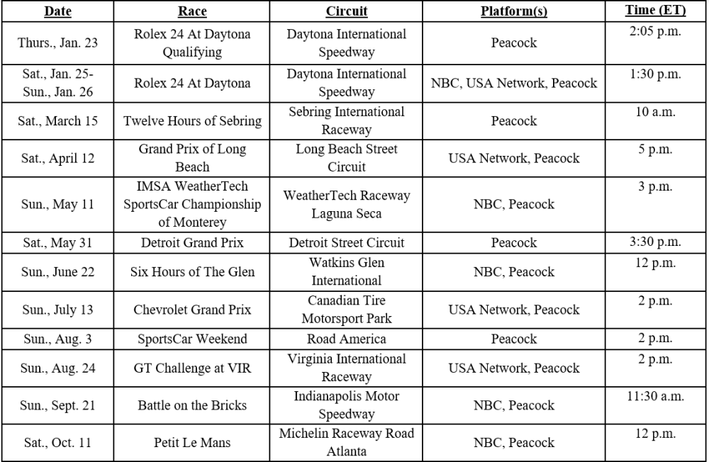Below is NBC Sports’ 2025 IMSA WeatherTech SportsCar Championship schedule: