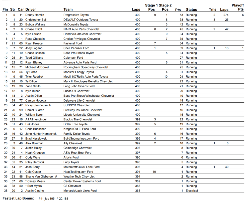 With flawless work from his pit crew, the driver of the No. 11 Joe Gibbs Racing Toyota led 274 of the last 275 laps—with the only exception a lap credited to pole winner Christopher Bell, who raced side-by-side with Hamlin after the final restart on lap 326.