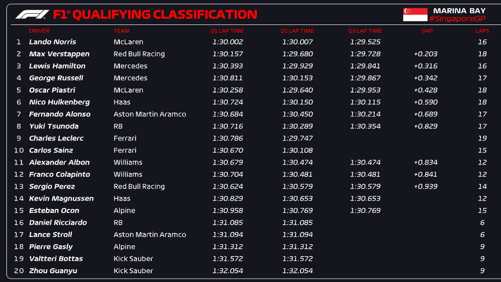 Piastri will start from fifth ahead of an impressive Nico Hulkenberg, with Fernando Alonso seventh and Yuki Tsunoda eighth, in front of the two Ferraris who didn’t have a valid Q3 time.