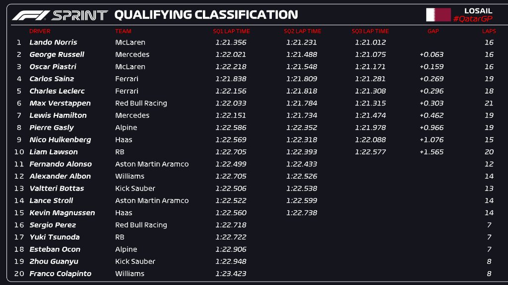 Russell then emerged as his closest challenger, and from pit lane Norris watched the Mercedes driver set three personal best sectors but fall just 0.063s short. Norris thus scraped through for his second Sprint pole of the year following his P1 start in China.