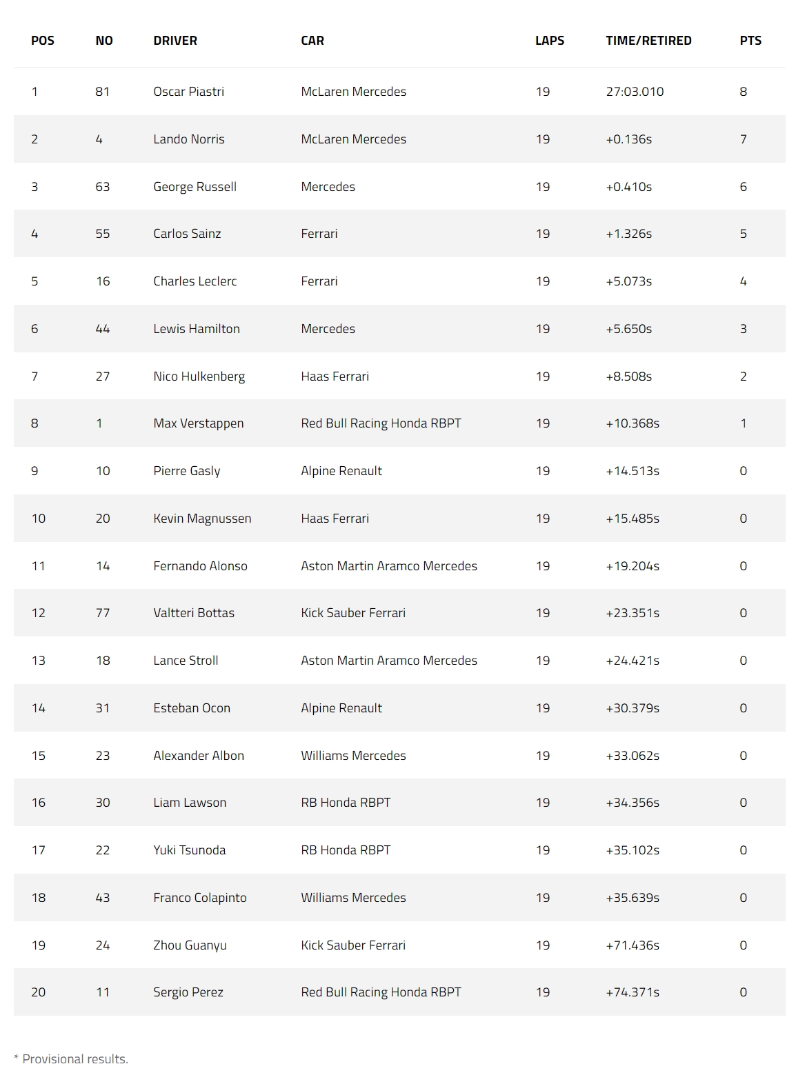 Norris nailed his start from pole to hold the lead into he first turn, but front-row starter George Russell was challenged by Piastri, starting third. The Australian took the Briton side by side around the outside into the first turn before scything down his inside into Turn 2 for a McLaren dream start to the race.