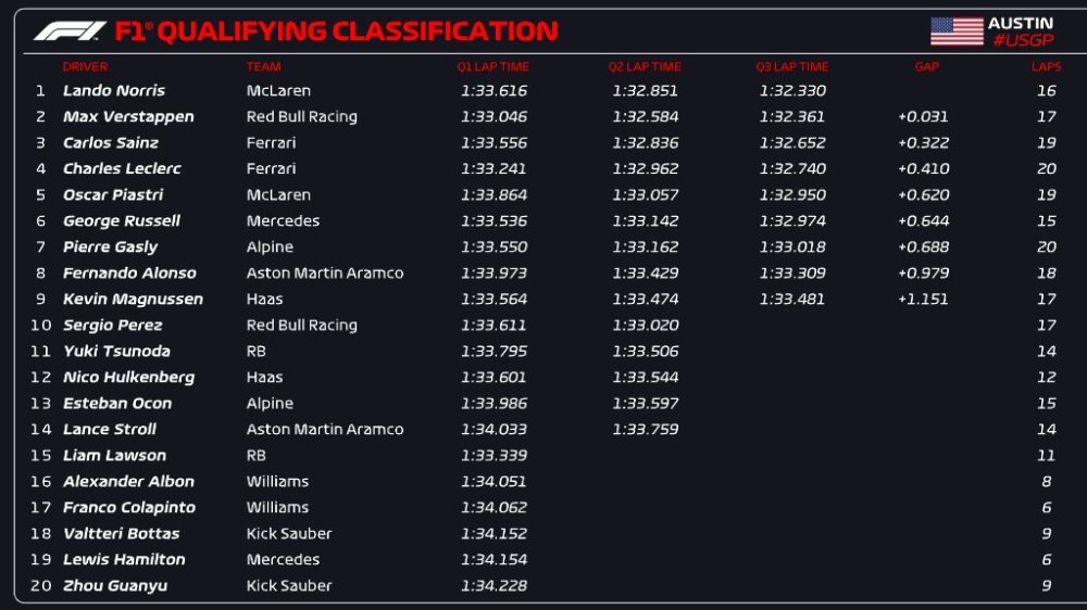 The duel was interrupted by Russell, who lost control of his car high speed at Turn 19 and spun into the barriers. With both Verstappen and Norris behind him on the track, both drivers were forced to abandon their laps, allowing Norris to claim an unexpected pole.