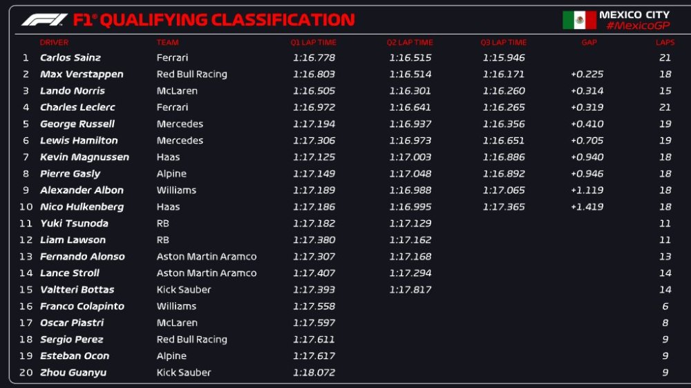 Carlos Sainz will start the Mexico City Grand Prix from pole position ahead of Max Verstappen and Lando Norris after frontrunners Oscar Piastri and home favorite Sergio Perez were dumped out of qualifying in Q1.